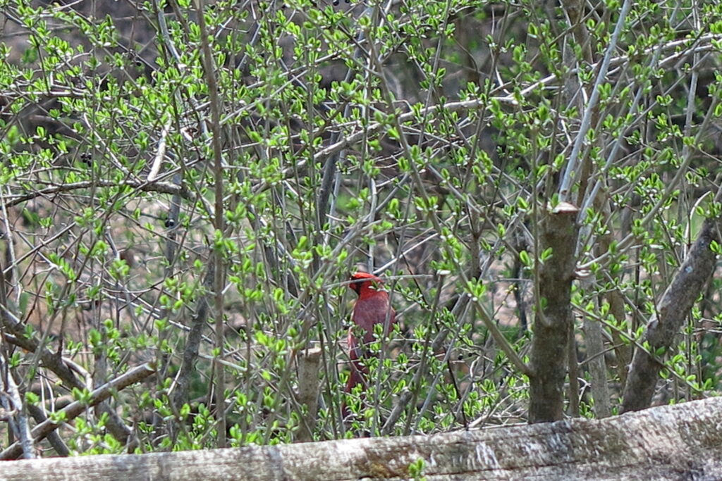 In this observation, a Northern Cardinal was seen resting quietly within a forested area in Northern Pennsylvania. Surrounded by dense branches and early spring vegetation, the bird remained perched on a low structure, offering a clear view of its vibrant plumage against the muted tones of the woodland setting.